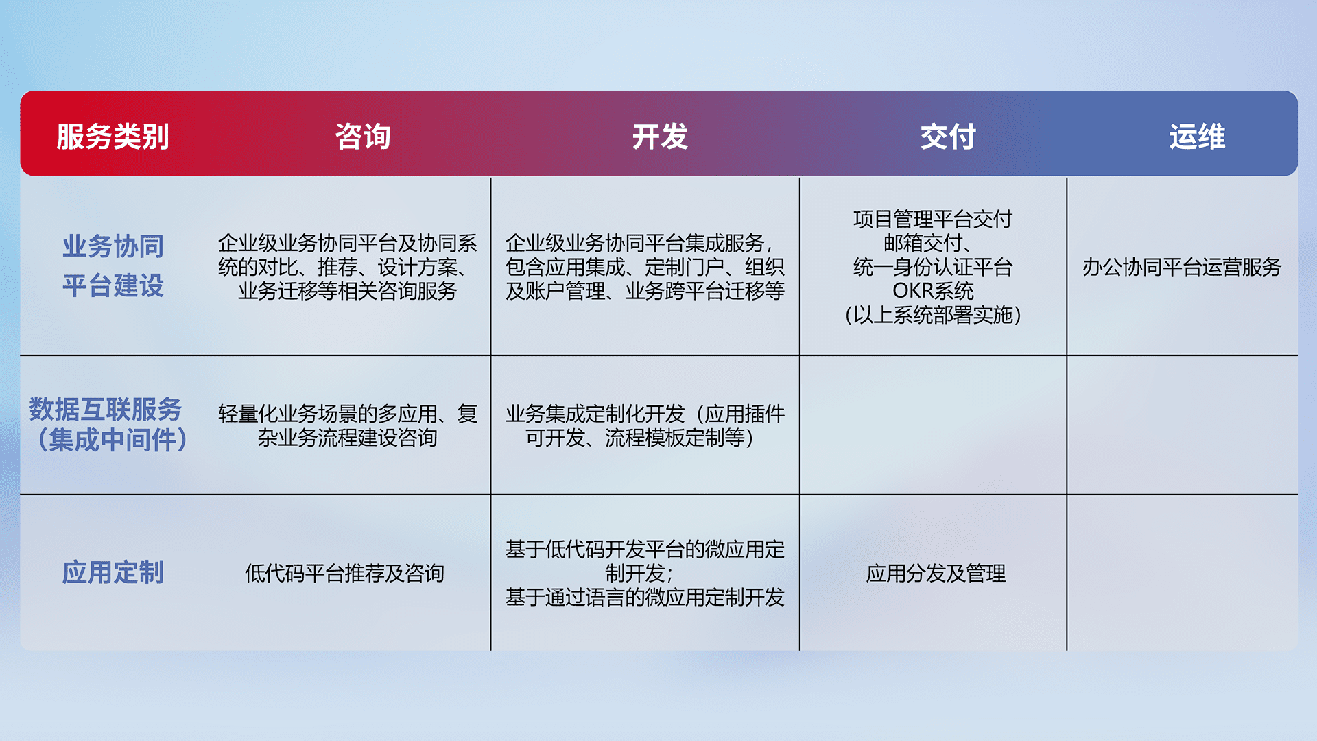 针对钉钉、、、企微、、IDaas等平台级产品提供产品的规划、、、、方案、、交付、、、定制化开发等服务,,实现如统一协同办公、、、、智能客户服务、、混合会议管理、、、智能数据查询、、等业务场景,,,,实现数字化转型。。。