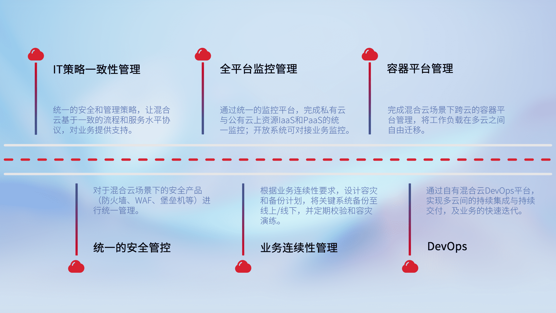 通过多云纳管,,,,以统一的资源数据模型把客户的云资源进行抽象和封装,,,,进而实现对多云资源的统一操作,,保障云资源管理的可靠性、、、、稳定性与可用性。。。量身定制化运维内容,,,,配置、、、、开发运维、、补丁管理、、、备份、、、监控、、、、认证和访问管理、、、、审计和日常巡检等,,,,保障在用云过程中的可靠度,,,稳定度以及高可用率。。。。